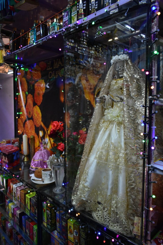 Sur les traces de ces hypothèses de l’origine coloniale de cette dévotion à la Mort, mon itinéraire m’a mené à Santo Domingo Yanhuitlan, dans l’état d’Oaxaca. L’ancien couvent y abrite une image de la Santa Muerte, une des plus anciennes de ses multiples variations, datant du 18e siècle et qui faisait, jusqu’à ce qu’elle soit récemment mise sous cloche dans le musée du couvent, l’objet d’un important culte local.